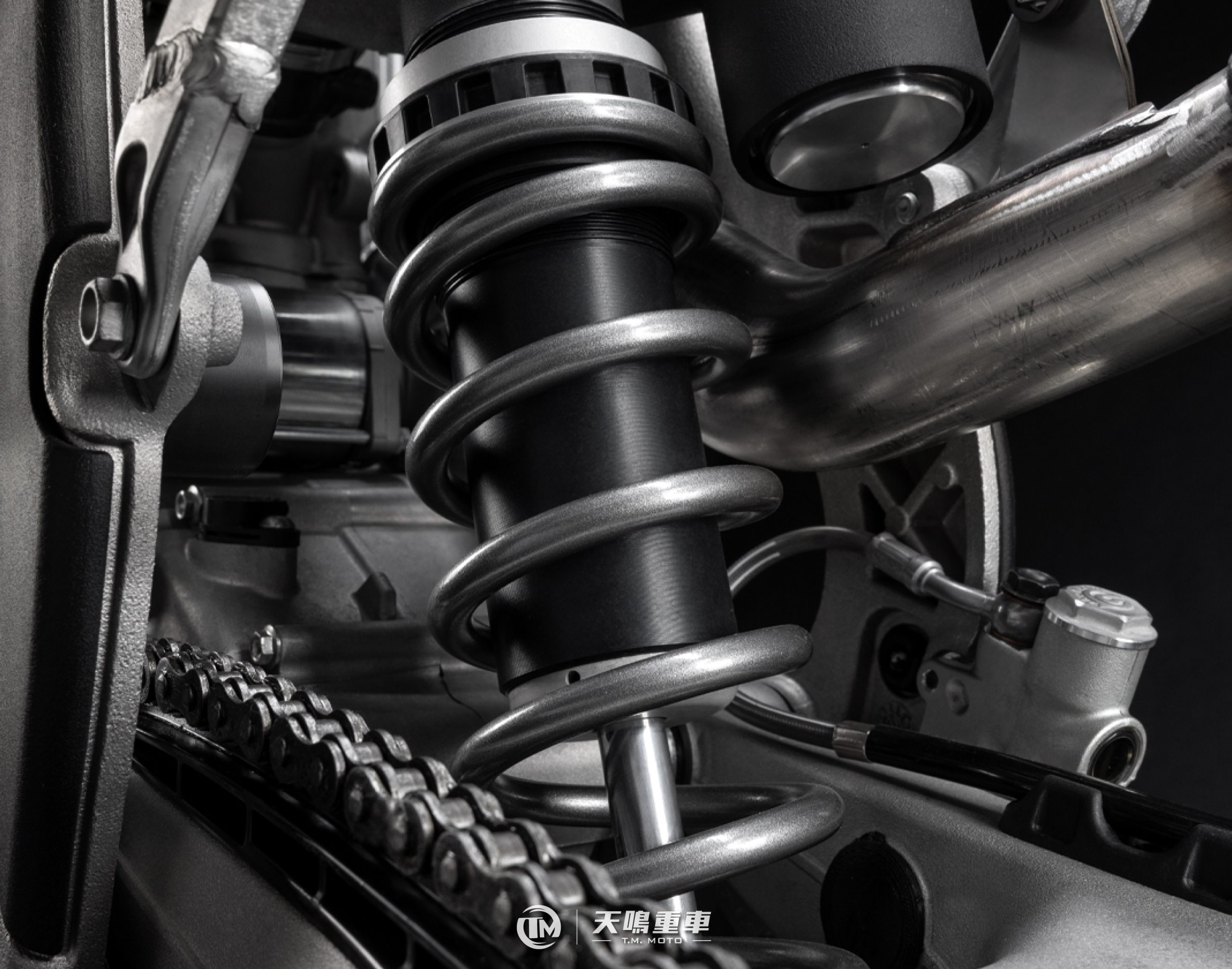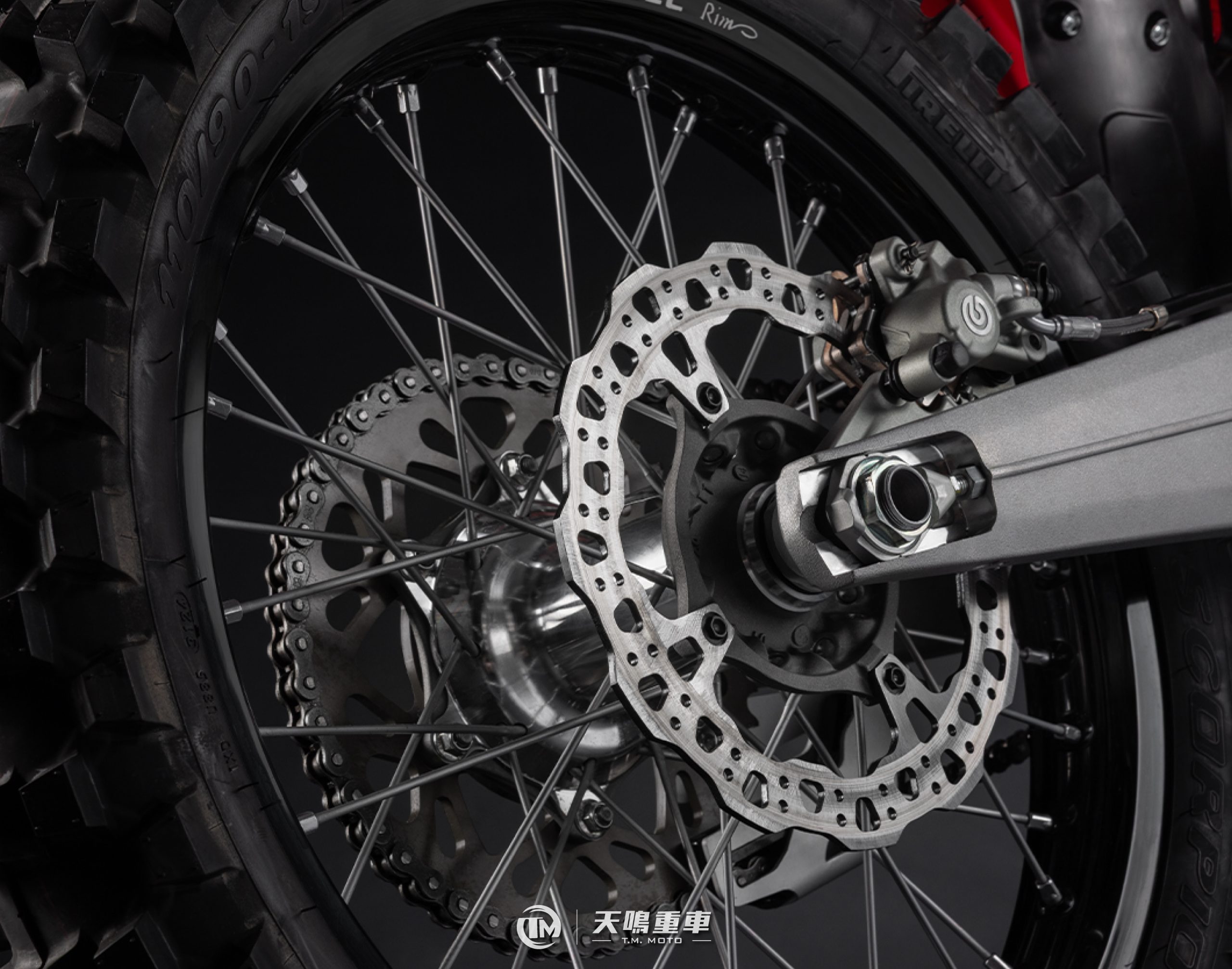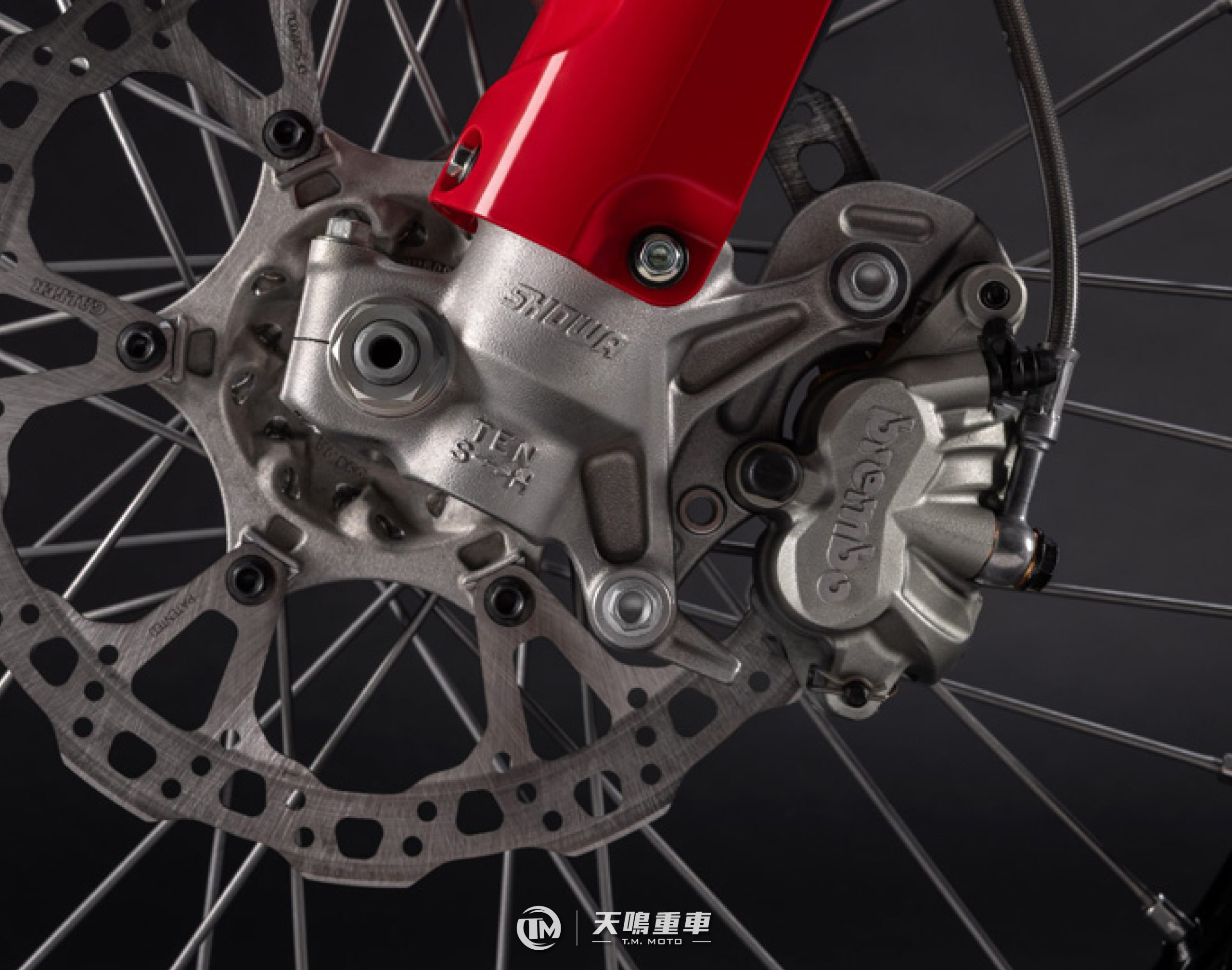 鋁合金車架結構僅由 11 個元件打造,輕量且剛性極高,搭配 Showa 49 mm 全可調倒叉與多連桿後避震,精準傳遞地形回饋;制動系統採 Brembo 卡鉗與 Galfer 碟盤,反應銳利、手感穩定 ;全車乾重僅 104.8 kg。