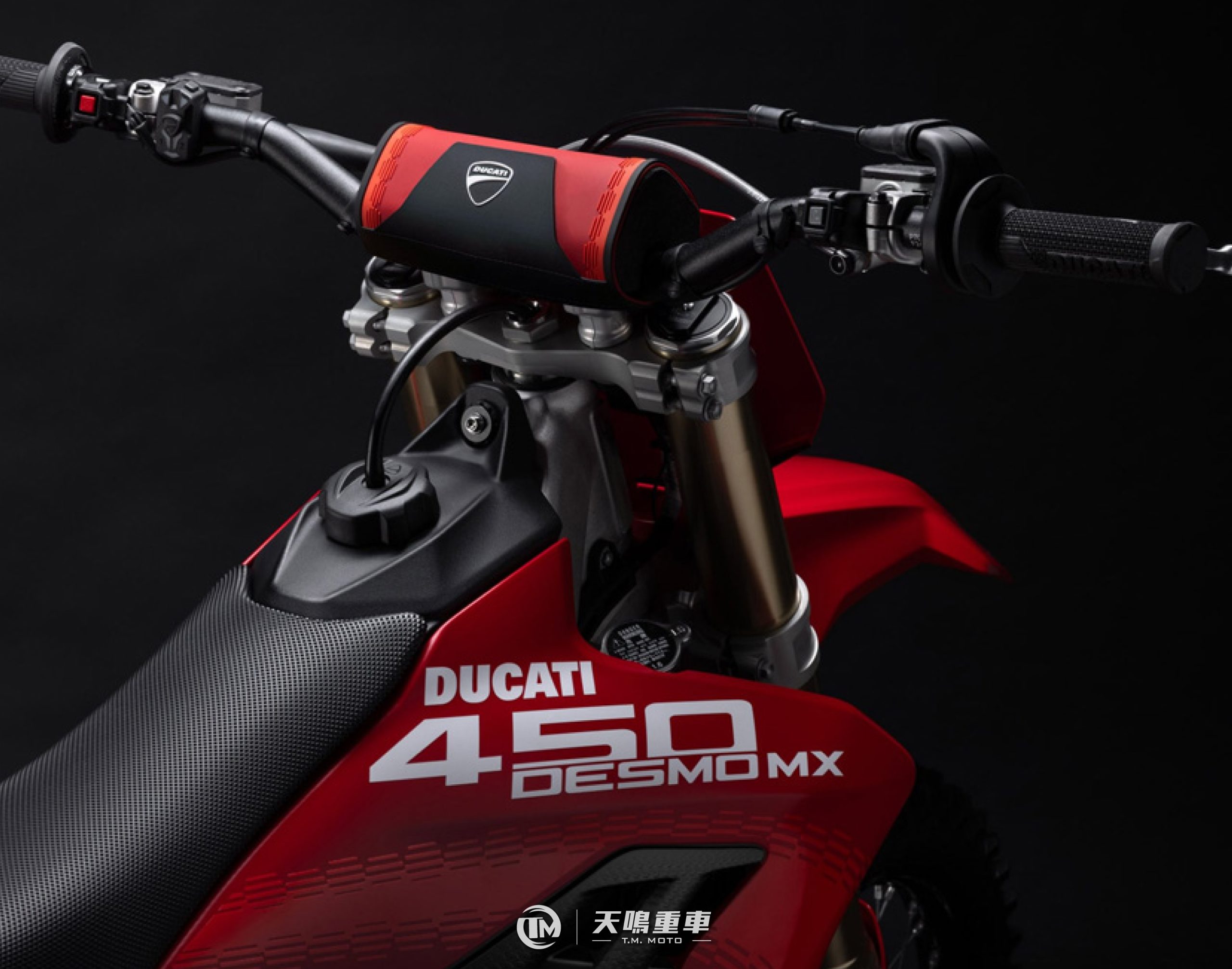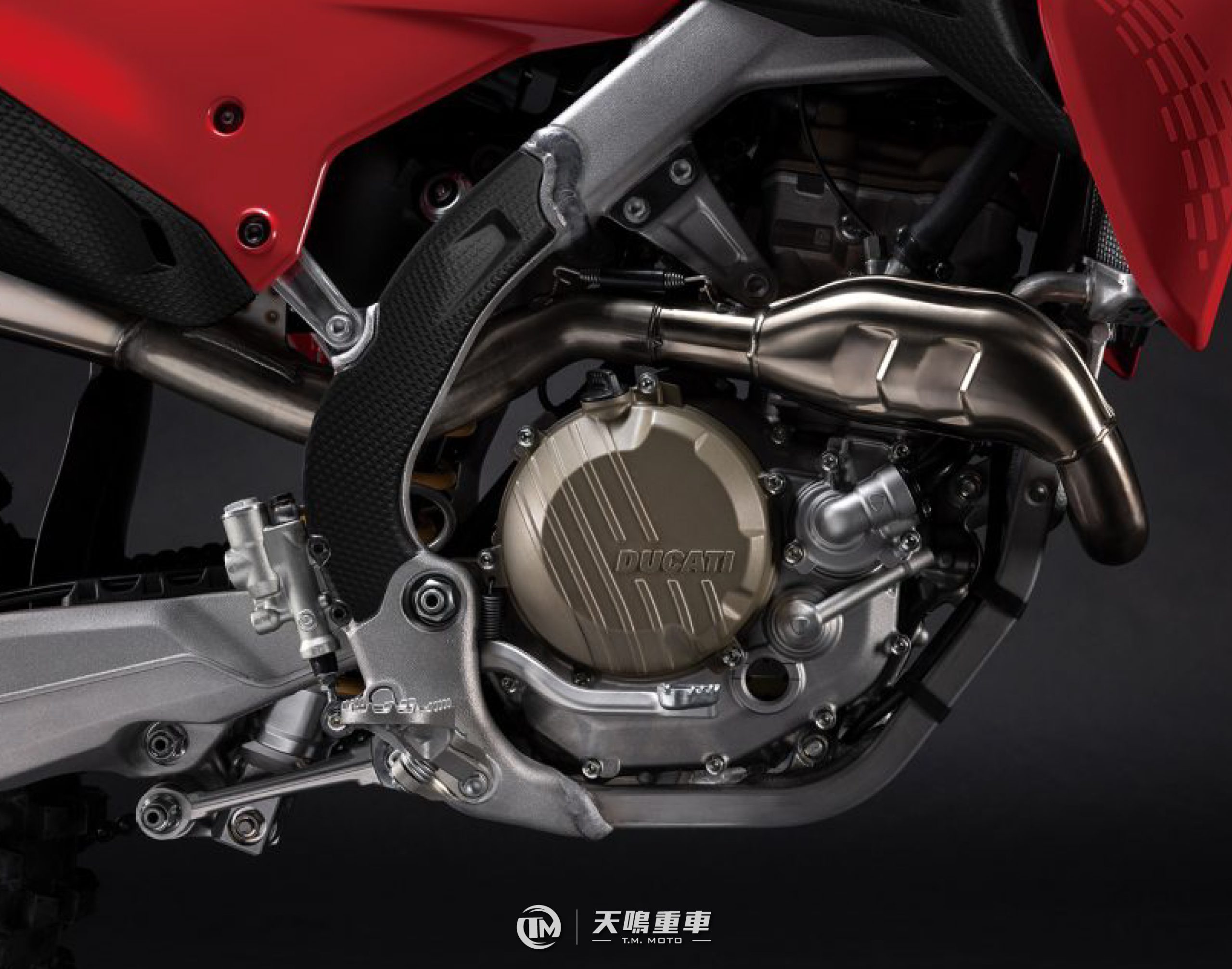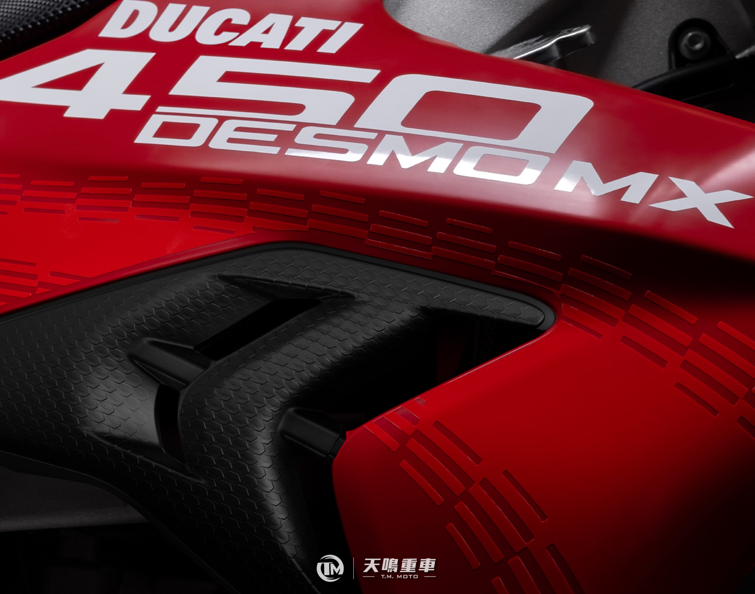 Desmo 450MX 搭載一具全新開發的449c.c.水冷四衝程單汽缸引擎,並首度在MX車系導入Ducati標誌性的Desmodromic氣門系統,輸出高達 63.5 hp / 53.5 Nm,轉速極限 11,900 rpm,瞬間爆發力與線性輸出兼具。
