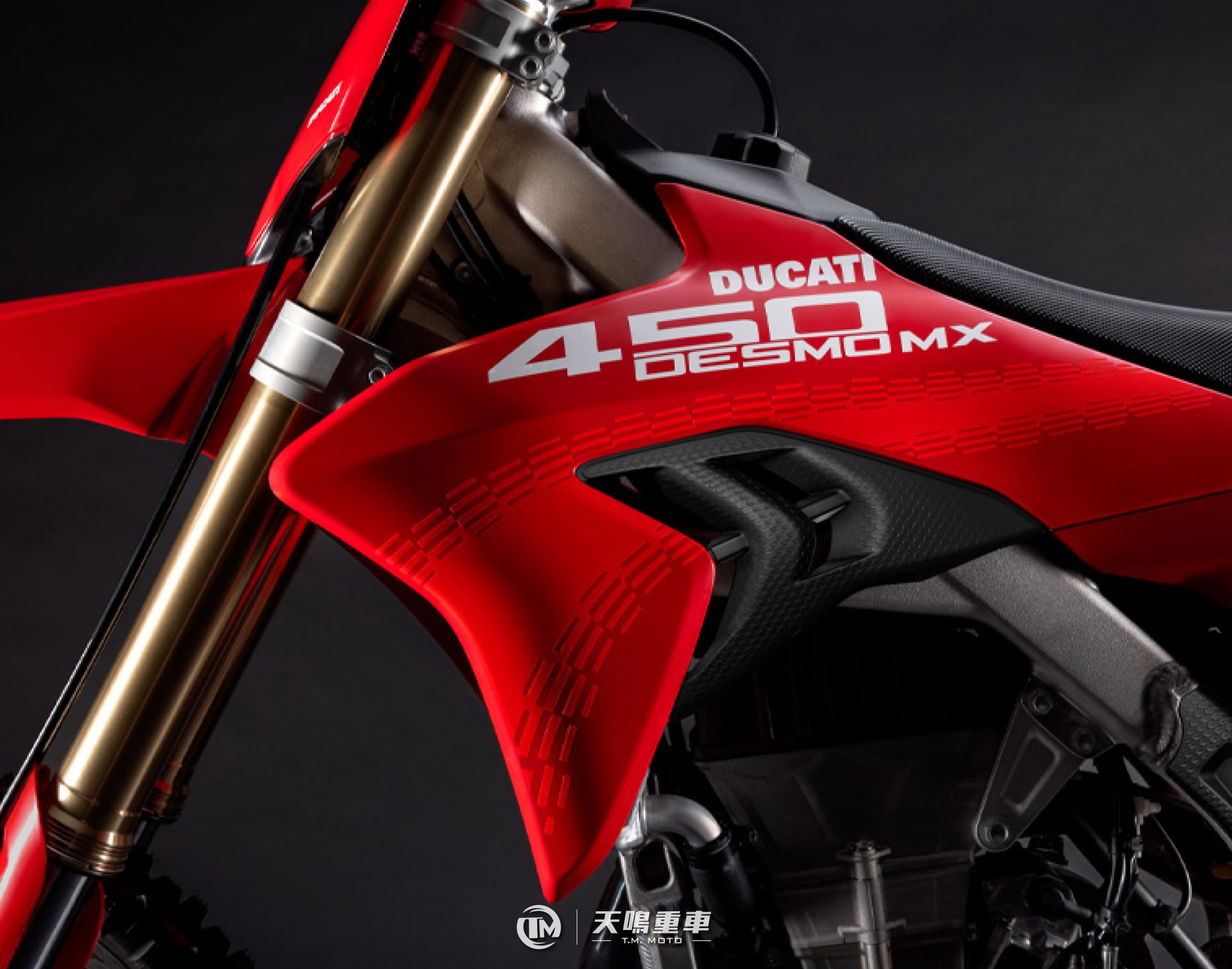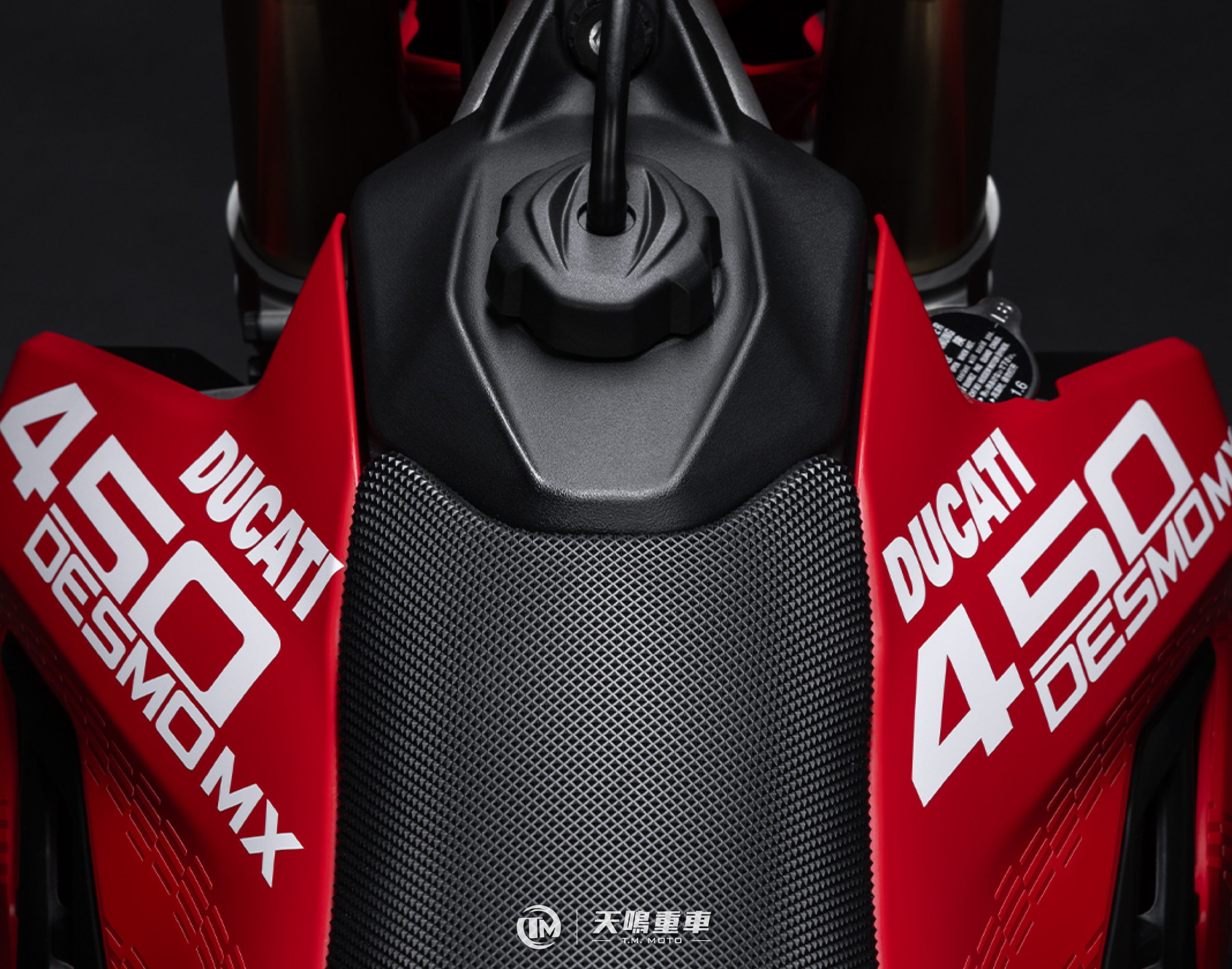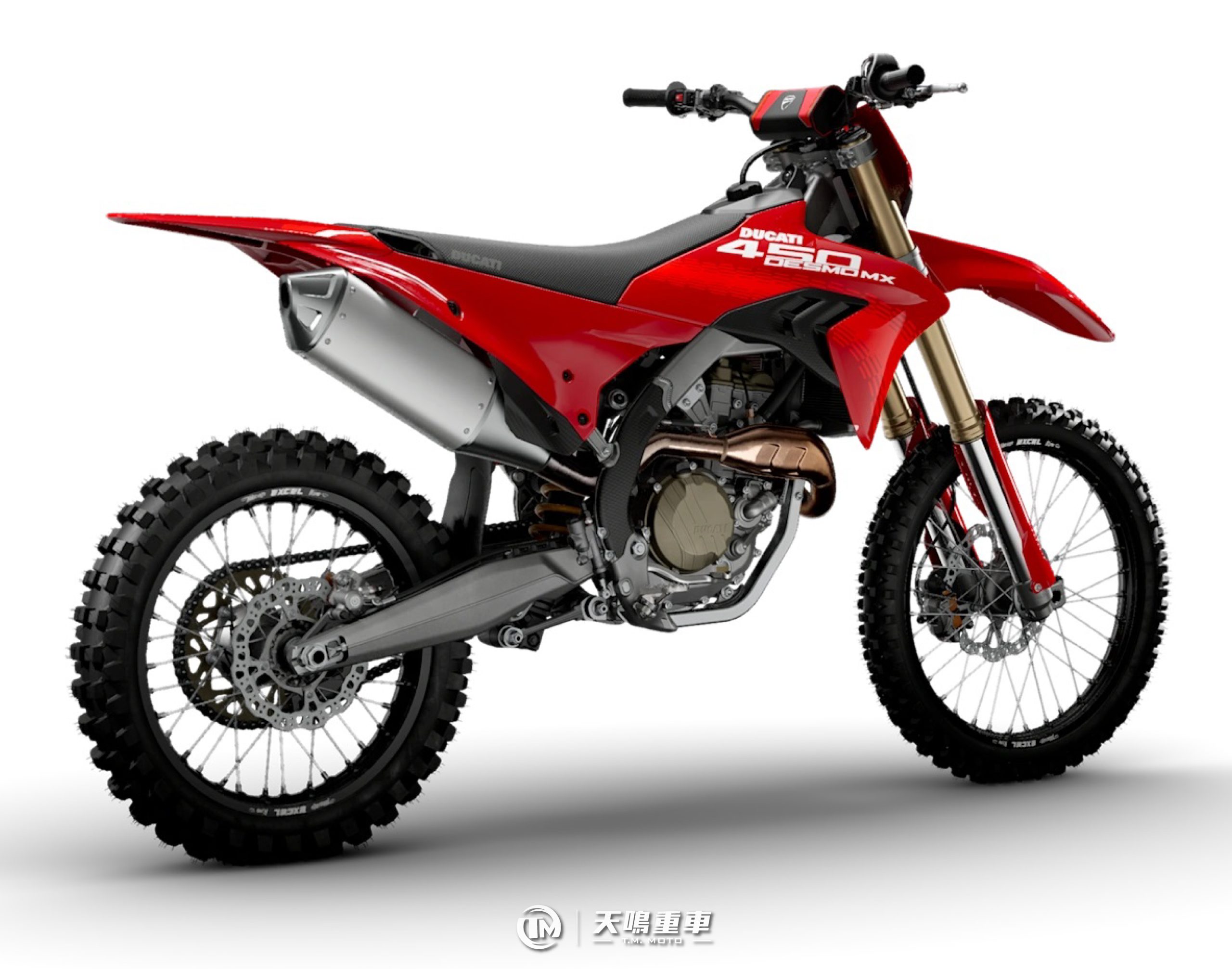 Desmo 450MX 搭載一具全新開發的449c.c.水冷四衝程單汽缸引擎,並首度在MX車系導入Ducati標誌性的Desmodromic氣門系統,輸出高達 63.5 hp / 53.5 Nm,轉速極限 11,900 rpm,瞬間爆發力與線性輸出兼具。